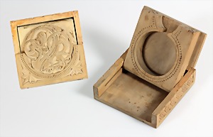 Taschenuhrenständer aus Holz um 1870, Birne ? oben und seitlich feine Schnitzereien, 67,5 x 66,5 x 22 mm