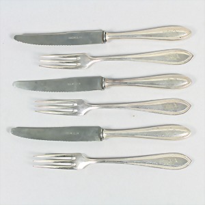 Obstbesteck, CBS, versilb. 90; je 3 Messer u. Gabeln mit zartem Perlrand, L = 16,8 u. 14,5 cm, Monogramm: H E