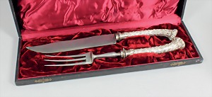 Jagd / Tranchierbesteck um 1900/10, Silber 800/000, ausgefallene Griffe in Geweihstruktur, L = 29,0 u. 32,0 cm, mit Originalschatulle