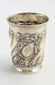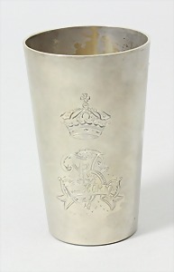 Becher vor 1900, Silber 800/000, gepunzt: WTB, Gravur: Krone u. Monogramm "JR" von HORN,, RV: M. Lindeck 19.11.97, D = 57,5 mm, H = 92,5 mm, 84,4 g