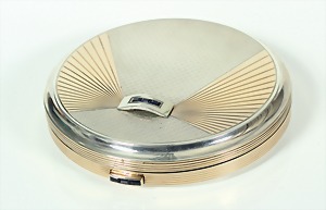Puderdose um 1940/50, Silber 925/000, gepunzt EGB, Deckel und Seiten teilvergoldet, je 3 synth. Saphire im Drücker und Deckel, hochwertig verarbeitet, D = 77,5 mm H = 14,8 mm, total 94,6 g