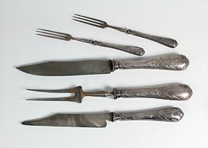 5 Besteckteile "CHRISTOFLE" versilbert, 1 x Tranchierbesteck, 1 x Messer, 2 Gabeln, L = 19,5 - 30 cm