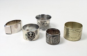 Lot: 5 Stück, Serviettenringe 1920er Jahre, Silber 800/000 u. 835/000, mit Monogramm / Namensgravur, total 96 g