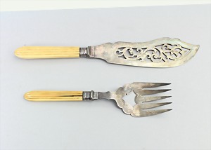 Fischtranchierbesteck um 1900, versilbert, gerillte Elfenbeingriffe, Klinge und Heber durchbrochen und graviert, L = 24 u. 32 cm