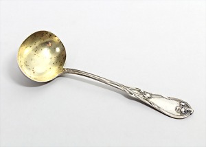 Soßenkelle, schöner JUGENDSTIL, Silber 800/000 (Restvergoldung), gepunzt UAL, L = 18,5 cm, schwere Ausführung, total 66 g