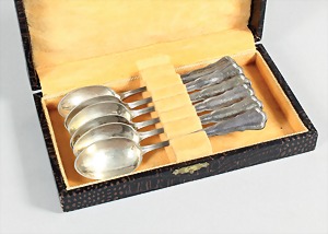 Eßbesteck 37 Teile: WELLNER 1. Hälfte 20.Jhd., Auflage 100, formschönes Besteck mit Monogramm: S, 6 x Kaffeelöffel L = 14,5 cm, 6 x Kuchengabeln L = 15 cm, 5 x Obstmesser L = 17,5cm, 6 x Dessertgabeln L = 17,8 cm, 6 x Dessertmesser l = 20,8 cm, 6 x Löffel L = 21 cm, 2 x kl. Vorlegegabel L = 18,2 cm