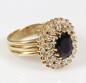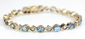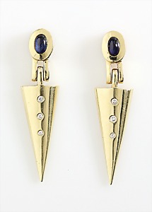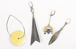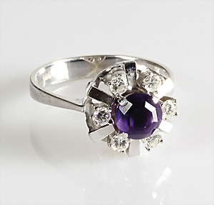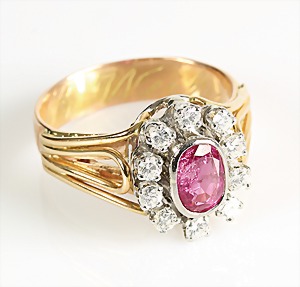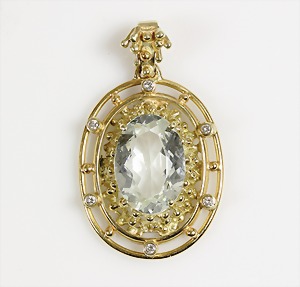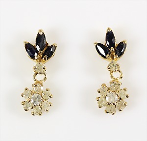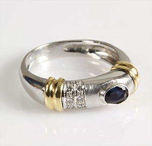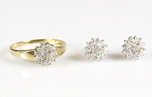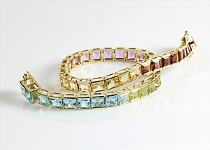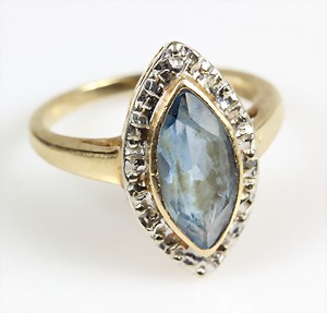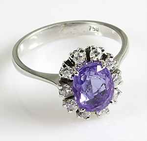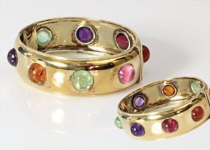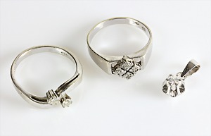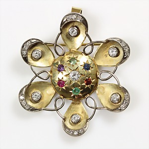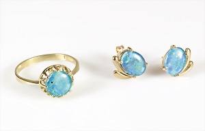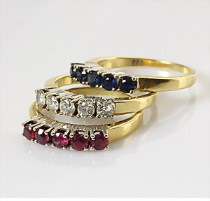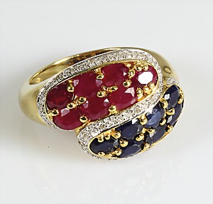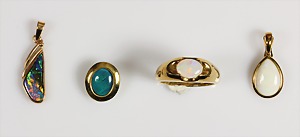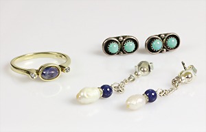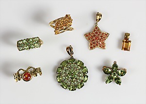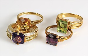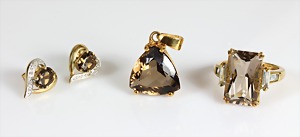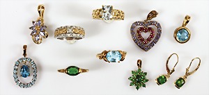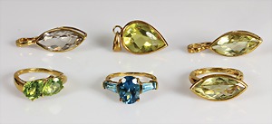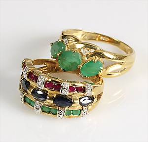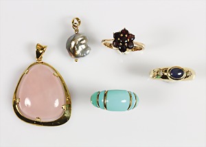 Lot 10 Teile, 1 Ring, GG 585/000, hellblauer Stein; 1 Ring, GG 333/000, grüner Stein; 1 Ring, GG 375/000, zentraler blauer Stein, alle 3 Ring RW ca. 53,5; 1 Ring, WG/GG 585/000, 1 Brillant ca. 0,04 ct weiß, RW ca. 49,5; 1 Anhänger, GG 585/000, 7 violette Steine in Navetteform, H = 25,5 mm; 1 Anhänger, GG 333/000, "HERZ", H = 28,5 mm; 1 Anhänger, GG 333/000, 19 blaue Steine, H = 27,5 mm; 1 Anhänger, GG 375/000, blauer runder Steine, H = 18,5 mm; 1 Anhänger, GG 333/000, 17 grüne Steine, H = 20,5 mm, Schlaufen teilweise zum Öffnen; Ohrhänger, GG 585/000, grüne Steine, H = 24 mm,