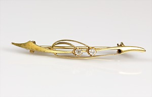 Brosche "JUGENDSTIL" um 1900, GG 585/000 nicht gemarkt (geprüft !), 2 Altschliff-Diamanten ca. 0,12 ct weiß, feuervergoldet, L = 5,0 cm