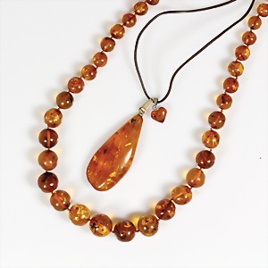 Lot: Kette, Bernstein, D = 7,8 - 15 mm, L = 53,3 cm; Anhänger, GG 333/000, H = 68,3 mm, kl. Herz, H = 17,5 mm