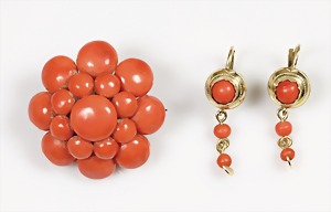 Lot: Brosche Ende 19.Jhd, Metall, 17 Korallenboutons, D = ca. 34 mm, schöner Originalzustand; Korallen-Ohrhänger mit Klappbügel, GG 585/000, H = ca. 33 mm