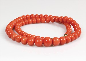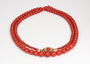 Korallenkette im Verlauf, Schließe GG 585/000, farbintensive Mittelmeerkoralle, D = 4,0 - 10,7 mm, L = 72 cm, total 46 g