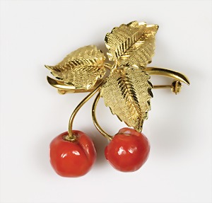 Brosche, GG 750/000, Korallenfrüchte mit gravierten Blättern, ca. 40 x 36 mm, total ca. 10,1 g