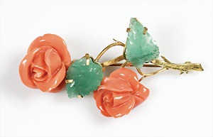 Brosche "ROSENZWEIG", GG 750/000, zwei geschnittene Korallenblüten mit gravierten Jade/Nefritblättern, L = 72 mm (kl. Chips an den Korallenblüten)
