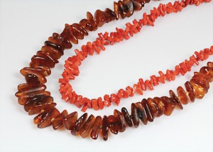 Lot: Bernsteinkette endlos, L = 73 cm, total 50,2 g; Korallenkette, Metallschließe, L = 80,5 cm, total 46,6 g