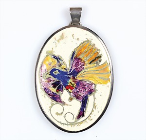 Emaille-Anhänger, Mitte 20.Jhd., Silber 800/000, farbiger "Paradiesvogel" auf cremfarbenem Hintergrund, H = 71,5 mm