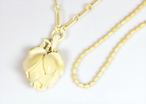 Lot Elfenbein, Anfang 20.Jhd.: Anhänger, Erbacher Rose, H = 62 mm (schwer gearbeitet !), Kette mit Haken (alt verlängert), L = 66 cm; Kette, Olivenform mit Drehschließe, D = 4,0 mm, 43,0 cm