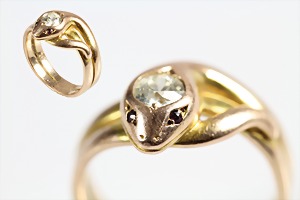 Diamantring "SCHLANGE" 2. Hälfte 19. Jhd., GG 585/000, Altschliffdiamant ct. 0,30 ct weiß, als Augen 2 kl. Rubine, RW ca. 52,5