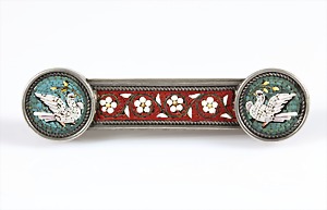Brosche ITALIEN um 1900, Silber (geprüft) fein gearbeitetes Mosaik, an beiden Enden weiße Tauben verbunden durch ein Band aus Blüten, in Anlehnung eines Italienischen Fußbodenmosaiks, L = 55,5 mm