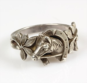Ring "JUGENDSTIL" um 1900, Silber 925/000, Pferdekopf mit Hufeisen, seitlich mit Blattwerk, RW ca.59
