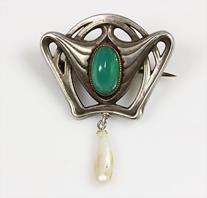 Brosche, JUGENDSTIL um 1900/10, Silber 900/000 (DEPOSE), grüner Achatcabochon, Naturperle, H = 39 mm