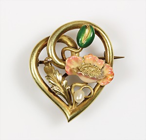 Brosche JUGENDSTIL um 1900, GG 585/000, sehr ausgewogen in ein stilisiertes Herz fein eingearbeitete emaillierte Blüte mit Blattwerk und Naturperle, H = 26,5 mm, (rückseitig gearbeiteter Haken um einen separaten Hänger zu integrieren), Sammelwürdig !