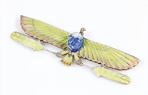 Brosche, deutsch 1920er Jahren, Silber 800/000, fliegender Skarabäus aus Lapis, Adler in hellgrünem Emaille u. Fensteremaille in verlaufenden Farben, gearbeitet (blique a jour), 82,5 x 27,5 mm, (winzige Rep. im Emaille)