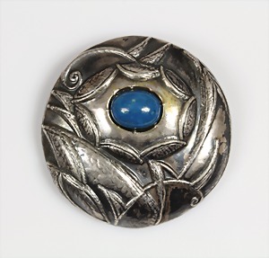 Brosche um 1930/40, Silber 800/000, signiert: KSt, aufwändig ziselierte Oberfläche mit blaugrünem Cabochon, D = 54,0 mm