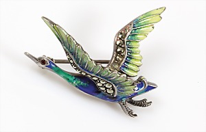 Brosche "VOGEL" 1940/50er Jahre, Silber 935/000, Emaille in leuchtend blau und grünen Farben, Markasiten, im Auge ein roter Stein, ca.34,0 x 26,5 mm
