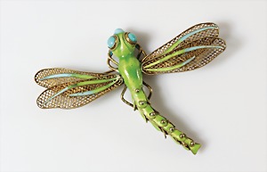 Brosche "LIBELLE" 1950/60er Jahre, Silber vergoldet, leuchtend grünes Emaille und blau abgesetzten Augen, der hintere Teil ist beweglich gearbeitet, ca. 52,0 x 66,0 mm