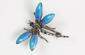 Brosche "LIBELLE" 1940/50er Jahre, Silber 935/000, leuchtend blaues Emaille, Markasiten, in die Augen sind rote Steine eingearbeitet, ca.34,0 x 35,0 mm