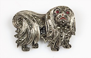 Brosche, "TIBETANISCHER TEMPELHUND" 1930er Jahre, Silber (geprüft), Augen mit roten Steinen versehen, Markasiten, plastisch ausgearbeitet, ca. 35,5 x 25,5 mm