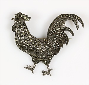 Brosche, "HAHN", Österreich 1920/30er Jahre, Silber 835/000, gemarkt: 835 WIEN, mehrreihige Markasiten, schwarzes Auge, plastisch ausgearbeitet, ca. 39,0 x 36,0 mm