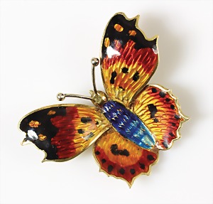 Brosche 1930/40er Jahre, "BUTTERSCOTCH-FALTER", Polen (Warschau), Silber 800/000, signiert: W 800 ORNO, plastisch ausdrucksvoll gearbeitete Brosche, ca. 56 x 50,5 mm