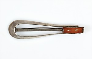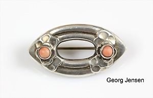Brosche um 1930, "GEORG JENSEN", Silber, sig.: GEORG JENSEN 34, 2 Korallen, ca. 36,3 x 19,7 mm