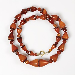 Kette, ART-DECO, Bernstein "BUTTERSCOTCH" ( Kegel, Kugeln u. Scheiben), Schließe Metall vergoldet, Kegel vorne D = 12,2 mm, L = 44,0 cm, total 16,0 g