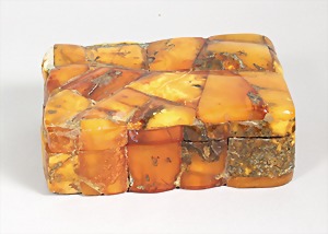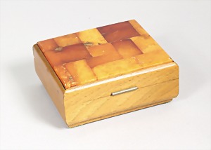 Holz-Schatulle um 1930 SBM, Deckel mit Bernsteinplatten ausgelegt ("BUTTERSCOTCH"), signiert: "HERGESTELLT IN DEN WERKSTÄTTEN DER STAATLICHEN BERNSTEINMANUFAKTUR KÖNIGSBERG PR", Maße: 10,2 x 8,7 x 4,5 cm, schöner Originalzustand !