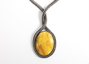 Collier, "BUTTERSCOTCH", Polen (Danzig), Silber 925/000, signiert: BIELAK K 925 BKB, großes schönes Stück, ca. 62 x 46 mm (ohne Fassung) 3-fach gearbeitete Zopfkette L = 56,0 cm, total178,2 g