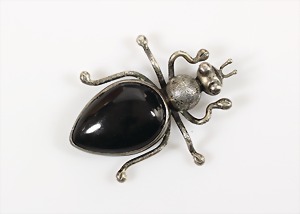 Brosche 1930/40er Jahre, "KÄFER", Polen (Warschau), Silber 800/000, signiert: W 800 ORNO, Onyxtropfen (Cabochon), plastisch ausdrucksvoll gearbeitete Brosche, ca. 59,8 x 47,8 mm