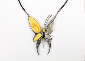 Collier im "JUGENDSTIL", 2. Hälfte 20.Jhd, "BUTTERSCOTCH-SCHMETTERLING", Polen, Silber (nicht gepunzt), Schmetterling ca. 89 x 112 mm, Lederband mit Hakenschließe, L = 49 cm