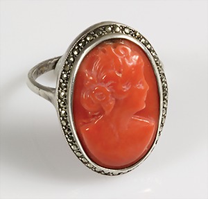 Ring Anfang 20.Jhd., Silber 835/000, Korallengemme (Damenportrait)19,5 x 12,5 mm, Markasiten, RW ca. 56,5