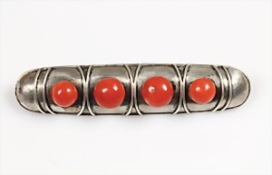 Brosche ART-DECO 1920/30 Jahre, Silber 900/000, 4 Korallenboutons, L = 59 mm