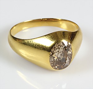 Diamantring um 1900, GG 585/000, brauner, naturfarbener, Altschliffdiamant (oval geschliffen), ca. 1,5 ct !! , einigen Naturals, RW ca. 53