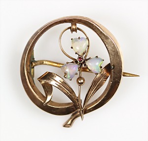 Brosche, "JUGENDSTIL" um 1900, GG 333/000, 3 Opalherzen, D = 23,5 mm