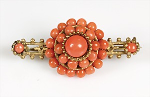 Brosche um 1850, Metall feuervergoldet, Korallenboutons, Korallenkugeln kreisförmig auf Draht aufgefädelt, L = 39,5 mm