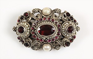 Brosche wohl "SIEBENBÜRGEN" um 1880, Silber (geprüft), Granate, Naturperlen, aufwändig gearbeitete Fassungen, die von zarten Perlkränzen umgeben sind, auch auch auf der Rückseite reich verziert, 38,7 x 25,7 mm
