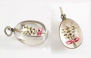 Anhänger "EI", IDAR OBERSTEIN Anfang 20.Jhd., Silber, Bergkristallei (zwei Hälften), Intaglio geschliffen und bemalt, "Weidenkätzchen mit einer Schleife gebunden", in Anlehnung der begehrten Fabergèeier, spiegelten die Eier aus Idar-Oberstein den damaligen Zeitgeist wieder