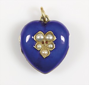 Anhänger um 1890, "HERZ" Medaillon, GG 000/000 ???, blaues Emaille, 5 Halb-Perlen, H = 25,5 mm