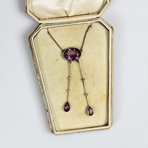 Collier ART-DECO um 1910, IDAR OBERSTEIN, zentraler ovaler Amethyst ca. 15,0 x 10,8 mm, 2 Amethysttropfen, 4 weiße Steine, L = 44,0 cm, mit Schatulle !