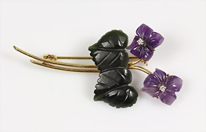 Brosche "BLÜTEN mit BLÄTTERN" IDAR OBERSTEIN Mitte 20.Jhd., GG 585/000, signiert A Sternchen D, 2 kl. Diamanten weiß , 2 Amethystblüten (graviert), 2 grüne Achatblätter (graviert), 57 x 26 mm