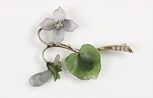 Brosche "BLUMENSTRAUSS" 1970er Jahre, WG 750/000, 5 Brillanten ca. 0,12 ct weiß, fein gravierte Calcedonblüten, 2 Blätter wohl Jade (fein graviert), ca. 45,5 x 38 mm